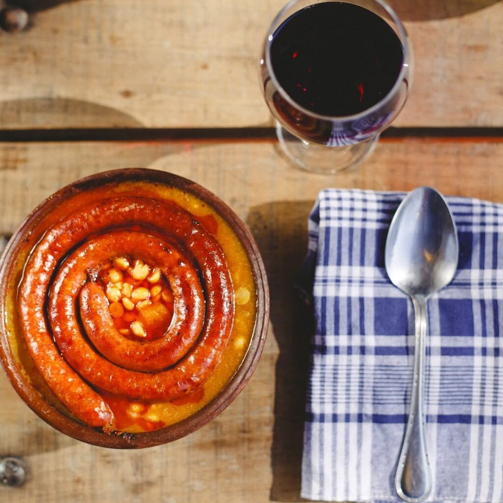 Nacimos en Tafalla, donde el viento huele a leña y domingo, y el tiempo se sazona con memoria. Venimos de Navarra, tierra de fuego lento y palabra cierta. Nuestra txistorra no solo se come: se comparte, se recuerda, se celebra. Es un lazo rojo entre generaciones, un canto breve al placer sencillo.