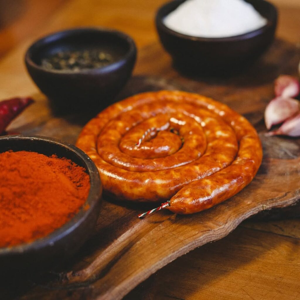 Nuestra txistorra artesanal, nacida de la tradición navarra, se encuentra con el carácter ahumado del merkén mapuche para crear una experiencia única.